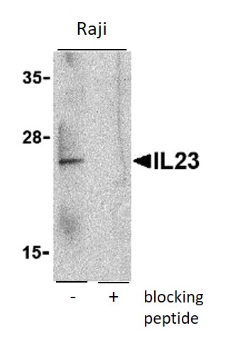 Western blot: Raji cell lysate stained with ARG59349 anti-IL23 antibody at 1 µg/ml in the absence and presence of blocking peptide.
