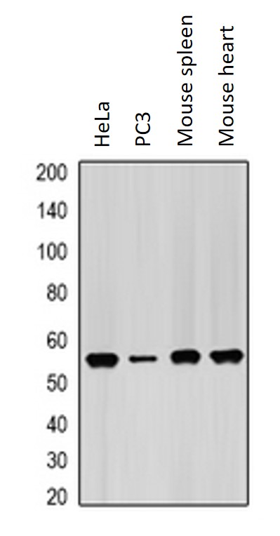 Western blot: HeLa, PC3, Mouse spleen and Mouse heart lysates stained with ARG40388 anti-IMPDH2 antibody.