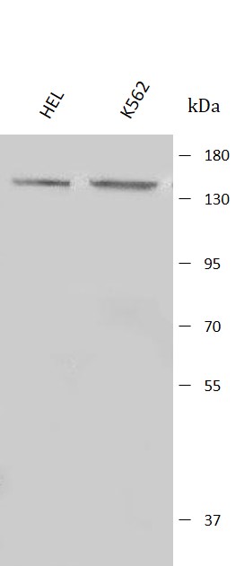 Western blot: HEL and K562 stained with ARG44444 anti-IMPG2 antibody at 0.5 μg/mL dilution.