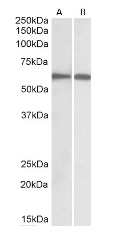 Western blot: 30 µg of Human spleen (A) and peripheral blood lymphocytes (B) lysates (in RIPA buffer) stained with ARG63227 anti-IRF5 antibody at 1 µg/ml dilution and incubated at RT for 1 hour.