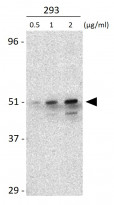 Western blot: 293 whole cell lysate stained with ARG57515 anti-IRF7 antibody at 0.5, 1, and 2 µg/ml.