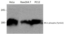 Western blot: HeLa, Raw264.7 and PC12 cells all treated with 100nM insulin for 30 min and stained with ARG57804 anti-IRS1 phospho (Tyr612) antibody at 1:500 dilution.