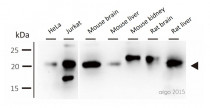 Western blot: 30 μg of HeLa, Jurkat, Mouse brain, Mouse liver, Mouse kidney, Rat brain and Rat liver lysates stained with ARG55235 anti-ITPA antibody at 1:500 dilution.