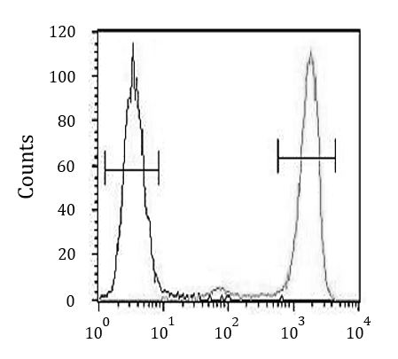Flow Cytometry: A375 cells stained with ARG55235 anti-ITPA antibody (right histogram) or without primary antibody control (left histogram), followed by incubation with FITC labelled secondary antibody.