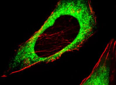 Immunofluorescence: HeLa cells stained with ARG55235 anti-ITPA antibody (green) at 1:25 dilution. Cytoplasmic actin was counterstained with Dylight Fluor® 554 conjugated Phalloidin (red).
