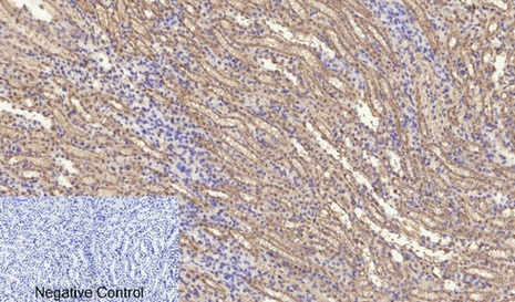 Immunohistochemistry: Paraffin-embedded Mouse kidney tissue. Antigen Retrieval: Heat mediation was performed in Sodium citrate buffer (pH 6.0) for 20 min. The tissue section was stained with ARG66663 anti-JAK1 antibody at 1:200 dilution, overnight at 4°C. Negative control was used by secondary antibody only.