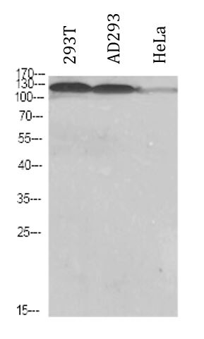 Western blot: 293T, AD293 and HeLa cell lysates stained with ARG66663 anti-JAK1 antibody at 1:1000 dilution.