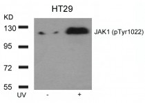 Western blot: Extracts from HT29 cells untreated or treated with UV stained with ARG51648 anti-JAK1 phospho (Tyr1022) antibody.