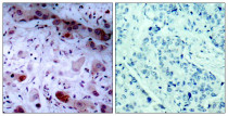 Immunohistochemistry: Paraffin-embedded Human breast carcinoma tissue stained with ARG51648 anti-JAK1 phospho (Tyr1022) antibody (left) or the same antibody preincubated with blocking peptide (right).