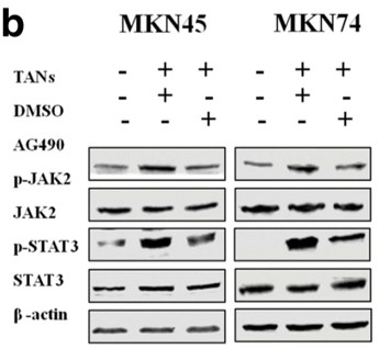 Western blot: Human GC stained with ARG57812 anti-JAK2 phospho (Tyr1007 / Tyr1008) antibody, ARG57629 anti-JAK2 antibody, ARG51549 anti-STAT3 phospho (Tyr705) antibody and ARG53604 anti-STAT3 antibody.
