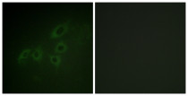 Immunofluorescence: A549 cells stained with ARG66665 anti-JAK3 antibody. The picture on the right was blocked with the synthetic peptide.