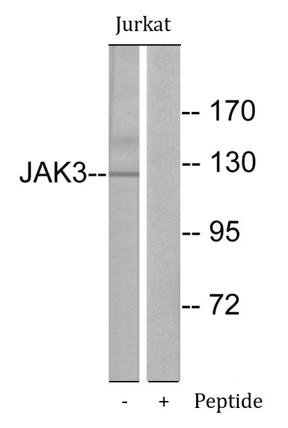 Western blot: Jurkat cell lysate stained with ARG66665 anti-JAK3 antibody. The lane on the right was blocked with the synthetic peptide.