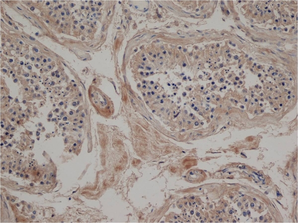 Immunohistochemistry: Paraffin-embedded Human testis stained with ARG23297 anti-Jagged 2 antibody [HMJ2-1] followed by Goat anti Hamster IgG (HRP).