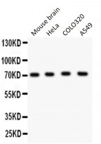 Western blot: 50 µg of Mouse brain, 40 µg of HeLa, 40 µg of COLO320 and 40 µg of A549 cell lysates stained with ARG59896 anti-KCND1 / Kv4.1 antibody at 0.5 µg/ml dilution.