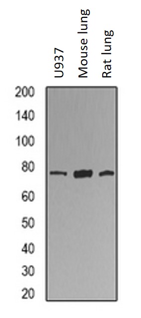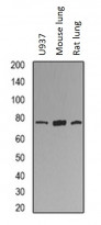 Western blot: U937, Mouse lung and Rat lung lysates stained with ARG40389 anti-KIF2B antibody.