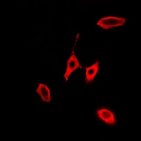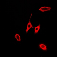 Immunofluorescence: Formalin-fixed A549 cells were permeabilized with 0.1% Triton X-100 in TBS for 5-10 minutes and blocked with 3% BSA-PBS for 30 minutes at room temperature. Cells were stained with ARG66465 anti-KLK10 / Kallikrein 10 antibody (red) in 3% BSA-PBS and incubated overnight at 4°C in a hidified chamber.