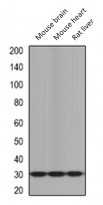 Western blot: Mouse brain, Mouse heart and Rat liver lysates stained with ARG66465 anti-KLK10 / Kallikrein 10 antibody.