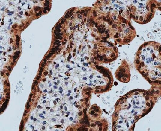 Immunohistochemistry: Formaldehyde-fixed and paraffin-embedded Human placenta tissue. Antigen Retrieval: Heat mediation was performed in EDTA buffer (pH 9.0). Samples were stained with ARG41857 anti-LIN28B antibody at 1:500 dilution for 1 hour at RT.