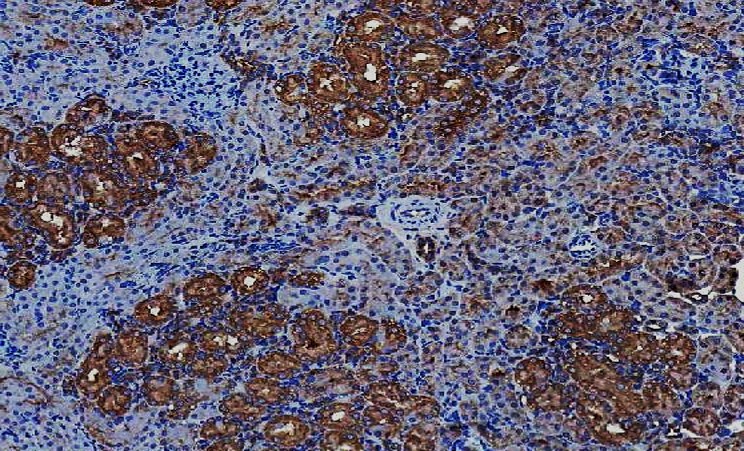 Immunohistochemistry: Rat kidney stained with ARG44402 anti-LIN7C antibody at 2 μg/mL dilution.