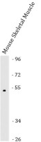 Western blot: Mouse Skeletal Muscle stained with ARG46258 anti-LMX1A antibody.