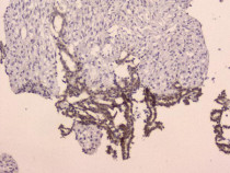 Immunohistochemistry: Paraffin-embedded Human mammary cancer tissue. Antigen Retrieval: Heat mediation was performed in Citrate buffer (pH 6.0) for 20 min. The tissue section was blocked with 10% goat serum. The tissue section was then stained with ARG43047 anti-LRIG1 antibody at 2 µg/ml dilution, overnight at 4°C.