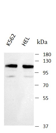 Western blot: K562 and HEL stained with ARG44407 anti-LRIG2 antibody at 0.5 μg/mL dilution.