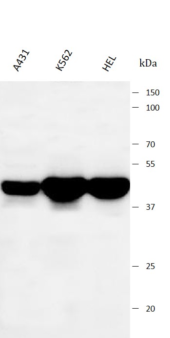 Western blot: A431, K562 and HEL stained with ARG44574 anti-LYAR antibody at 0.5 μg/mL dilution.