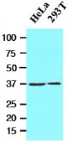 Western blot: 20 µg of HeLa and 293T stained with ARG56966 anti-Laforin antibody [k2A3] at 1:1000.