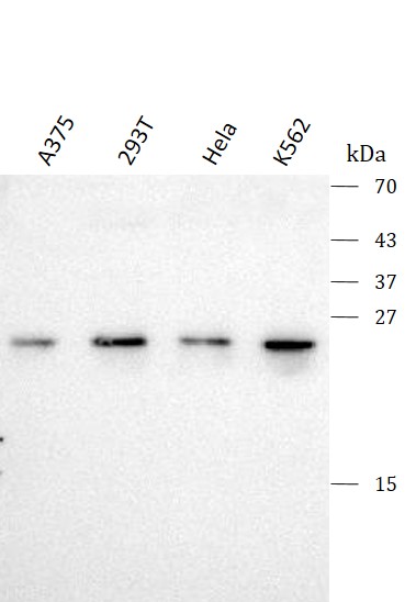 Western blot: A375, 293T, HeLa and K562 stained with ARG44133 anti-MAD2L2 / REV7 antibody at 0.5 μg/ml dilution.
