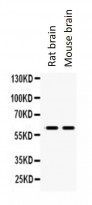 Western blot: 50 µg of Rat brain and Mouse brain lysates stained with ARG40379 anti-MAOB antibody at 0.5 µg/ml dilution.