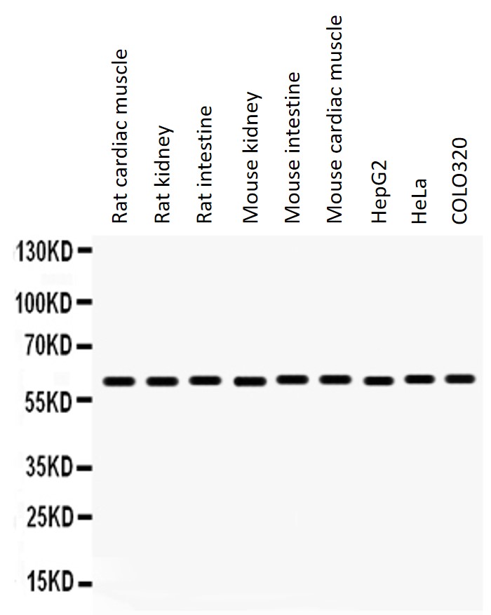 Western blot: 50 µg of Rat cardiac muscle, 50 µg of Rat kidney, 50 µg of Rat intestine, 50 µg of Mouse kidney, 50 µg of Mouse intestine, 50 µg of Mouse cardiac muscle, 40 µg of HepG2, 40 µg of HeLa and 40 µg of COLO320 whole cell lysates stained with ARG40379 anti-MAOB antibody at 0.5 µg/ml dilution.