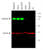 Western blot: HEK293, HeLa, SH-SY5Y, COS1, NIH/3T3 and C6 cell lysates stained with ARG11133 anti-MARCKS antibody (green) at 1:1000 dilution and ARG52320 anti-GAPDH antibody [1D4] (red) at 1:5000 dilution.