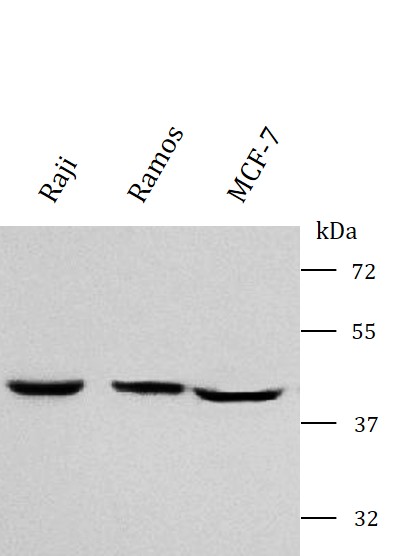 Western blot: Raji, Ramos and MCF-7 stained with ARG43908 anti-MCL1 antibody at 0.5 μg/mL dilution.