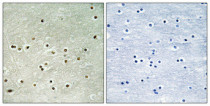 Immunohistochemistry: Paraffin-embedded Human brain tissue stained with ARG66544 anti-MCM4 phospho (Ser54) antibody at 1:100, 4°C and overnight. Antigen Retrieval: High-pressure and temperature Tris-EDTA buffer (pH 8.0). The picture on the right was blocked with the synthetic peptide.