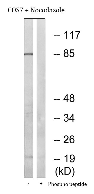 Western blot: COS7 cells treated with nocodazole (1 µg/ml, 16 hours) and stained with ARG66544 anti-MCM4 phospho (Ser54) antibody. The lane on the right was blocked with the phospho peptide.