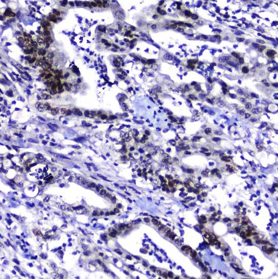 Immunohistochemistry: Human colon cancer stained with ARG45128 anti-MDC1 antibody at 1 μg/ml dilution.