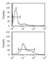 Flow Cytometry: HL-60 cells stained with ARG55687 anti-MDH1 antibody (bottom histogram) or without primary antibody as control (top histogram), followed by incubation with FITC labelled secondary antibody.