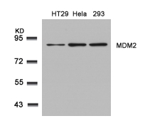 Western Blot: extracts from HT29, HeLa and 293 cells stained with anti-MDM2 antibody ARG51392.