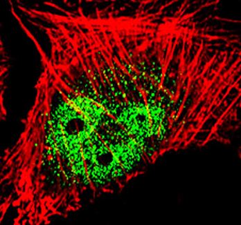 Immunofluorescence: HeLa cells were fixed with 4% PFA (20 min), permeabilized with Triton X-100 (0.1%, 10 min), then stained with ARG59073 anti-MEF2C antibody (green) at 1:25 dilution, 1 hour at 37°C. Cytoplasmic actin was counterstained with Alexa Fluor® 555 (red) conjugated Phalloidin (7 units/ml, 1 hour at 37°C).