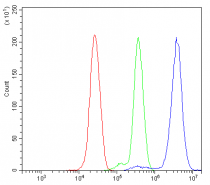 Flow Cytometry: THP-1 cells were blocked with 10% normal goat serum and then stained with ARG43104 anti-METTL14 antibody (blue) at 1 µg/10^6 cells for 30 min at 20°C, followed by incubation with DyLight®488 labelled secondary antibody. Isotype control antibody (green) was rabbit IgG (1 µg/10^6 cells) used under the same conditions. Unlabelled sample (red) was also used as a control.