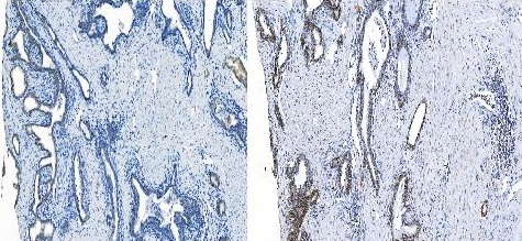 Immunohistochemistry: Paraffin-embedded Human breast cancer tissue. Antigen Retrieval: Heat mediation was performed in EDTA buffer (pH 8.0). The tissue section was blocked with 10% goat serum. The tissue section was then stained with ARG43104 anti-METTL14 antibody at 2 µg/ml dilution, overnight at 4°C. Left: Negative control.