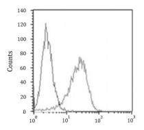 Flow Cytometry: SK-BR-3 cells stained with ARG55847 anti-MICA antibody (right histogram) at 1:25 dilution or isotype control antibody (left histogram), followed by incubation with Alexa Fluor® 488 labelled secondary antibody.