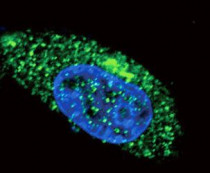 Immunofluorescence: MDA-MB-231 cells stained with ARG55847 anti-MICA antibody (green). DAPI (blue) for nuclear staining.