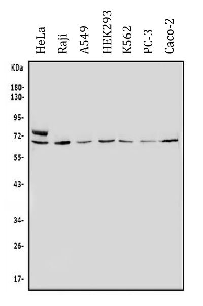 Western blot: 50 µg of sample under reducing conditions. HeLa, Raji, A549, HEK293, K562, PC-3 and Caco-2 whole cell lysates stained with ARG43139 anti-MNT antibody at 0.5 µg/ml dilution, overnight at 4°C.