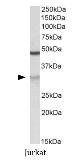 Western blot: 35 µg of Jurkat cell lysate (in RIPA buffer) stained with ARG42177 anti-MOB2 / HCCA2 antibody at 0.02 µg/ml dilution and incubated at RT for 1 hour.