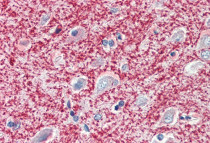 Immunohistochemistry: Paraffin-embedded Human cortex tissue. Antigen Retrieval: Steam tissue section in Citrate buffer (pH 6.0). The tissue section was stained with ARG63725 anti-MOG / Myelin oligodendrocyte glycoprotein antibody at 5 µg/ml dilution followed by AP-staining.