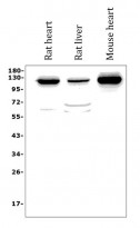Western blot: 50 µg of sample under reducing conditions. Rat heart, Rat liver and Mouse heart lysates stained with ARG43058 anti-MORC3 antibody at 0.5 µg/ml dilution, overnight at 4°C.