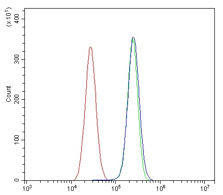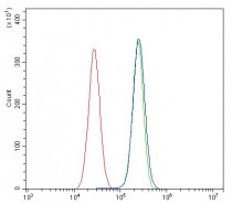 Flow Cytometry: U87 cells were blocked with 10% normal goat serum and then stained with ARG59030 anti-MPP1 antibody (blue) at 1 µg/10^6 cells for 30 min at 20°C, followed by incubation with DyLight®488 labelled secondary antibody. Isotype control antibody (green) was rabbit IgG (1 µg/10^6 cells) used under the same conditions. Unlabelled sample (red) was also used as a control.