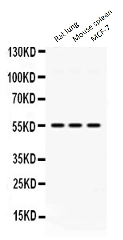 Western blot: Rat lung, Mouse spleen and MCF-7 lysates stained with ARG59030 anti-MPP1 antibody at 0.5 µg/ml dilution. The blot was developed using chemiluminescence (ECL) method (Catalog # EK1002).