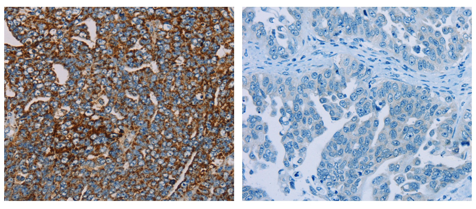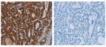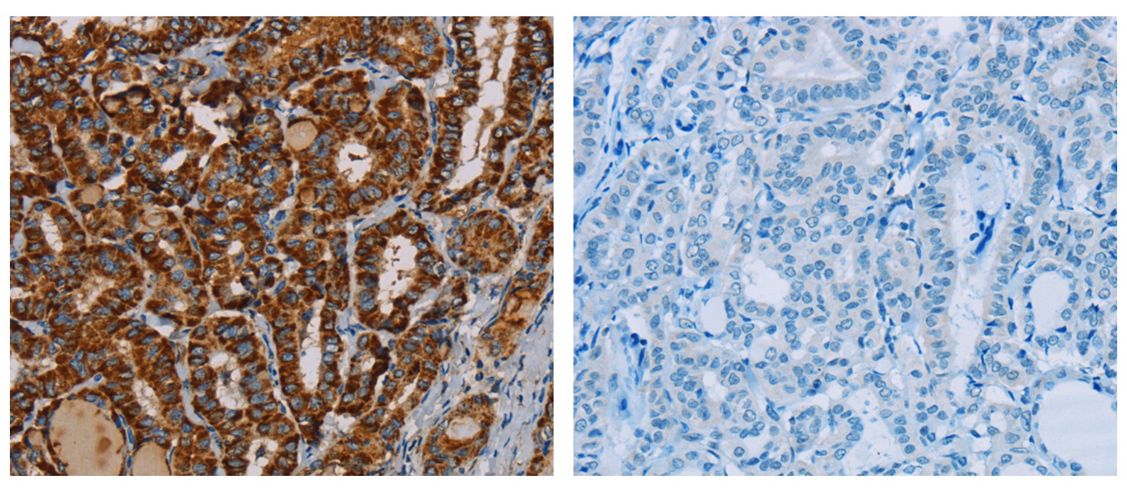 Immunohistochemistry: Paraffin-embedded Human thyroid cancer tissue stained with ARG65584 anti-MRPL12 antibody (left) at 1:25 dilution, or the same antibody preincubated with fusion protein (right). (Original magnification: ×200)